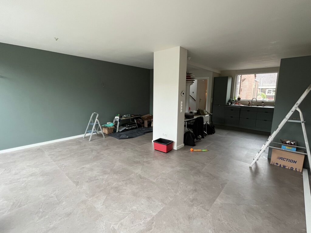 Als oplossing hebben we voor wat mogelijk was de verdieping open gebroken. Hierdoor is er nog een brede kolom blijven staan en een klein stukje wand. De keuken is vanuit het midden verplaatst naar de voorgevel zodat je altijd goed daglicht heb als je in je keuken bezig bent. Nu kan er ook een ruime eettafel geplaatst worden in de ruimte. Het woongedeelte is gelijk gebleven maar wel meer licht inval omdat de ruimte nu helemaal open is.