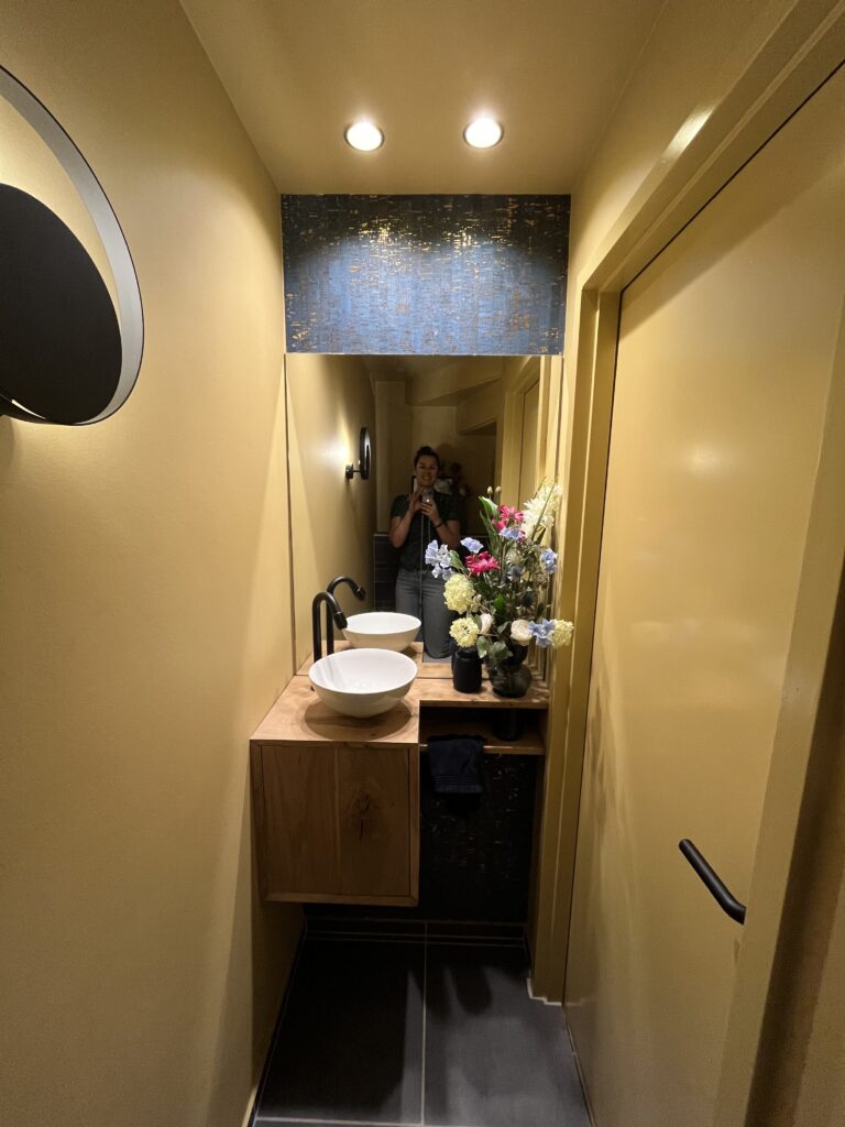 Het kleinste kamertje van ons eigen huis is ook een mooi project geworden. Hij is vergroot van een toilet van nog geen vierkante meter naar bijna twee vierkante meter. De wanden en het plafond hebben we in een goudgele kleur geschilderd met afneembare verf. Door de goudgele kleur wordt hij nu de goldroom genoemd.