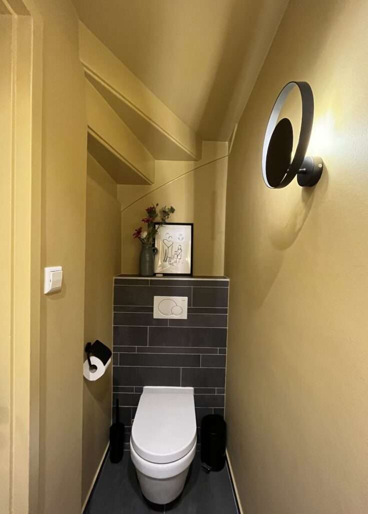 Als je dan toch bezig bent, dan neem je gelijk de verlichting mee. Van één centraal lichtpunt in het plafond zijn we nu naar één wandlamp en twee spotjes in het plafond gegaan. Een echte upgrade voor het kleinste kamertje in huis.